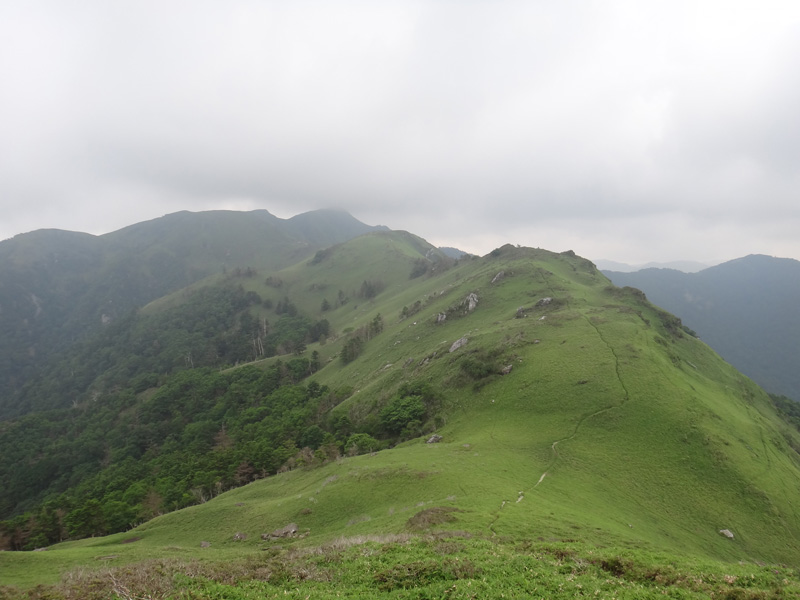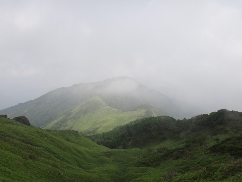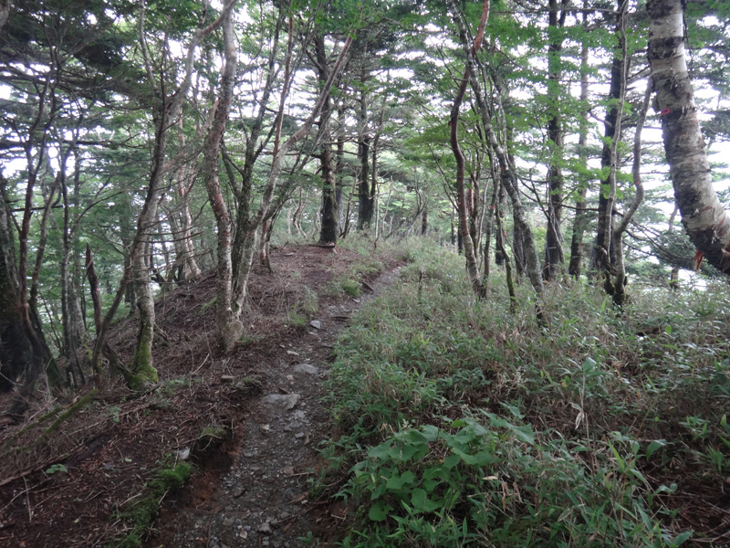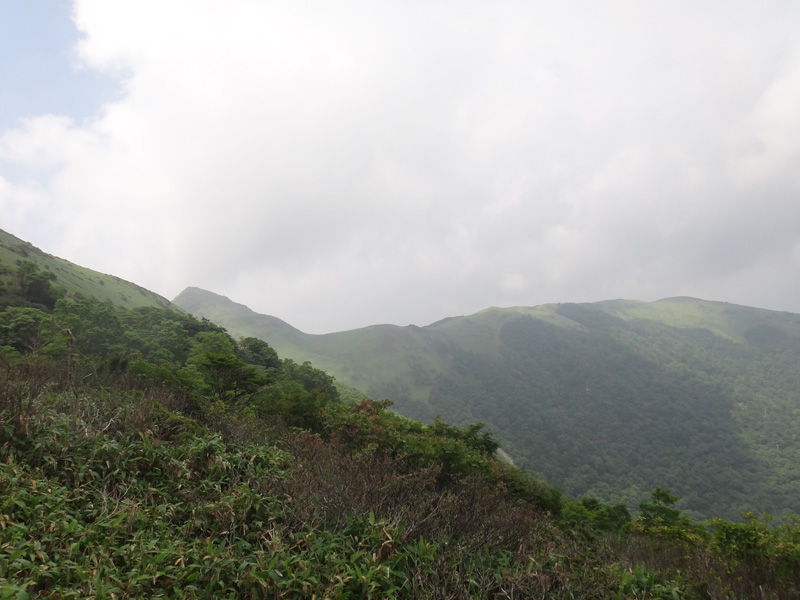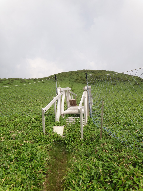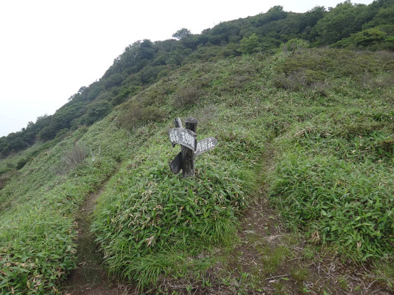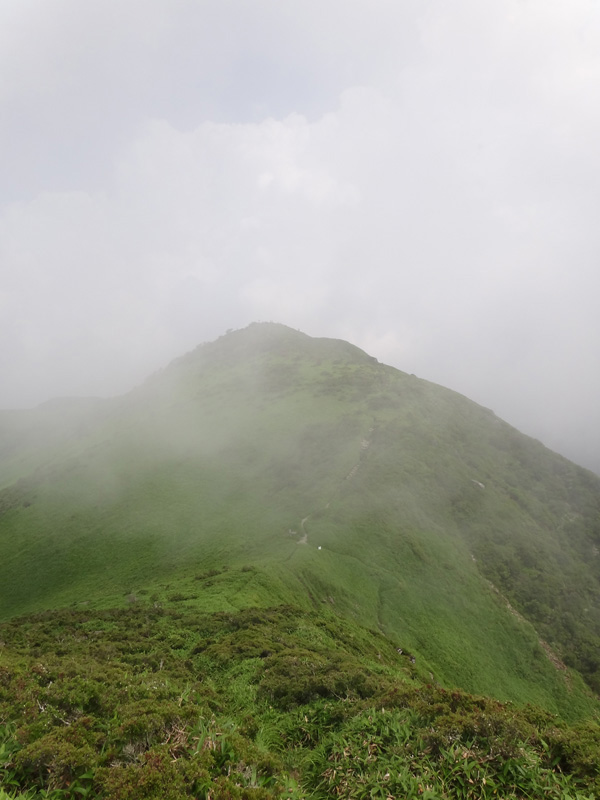 ここからもそこそこの傾斜の道が続く。 樹林帯を抜け、笹原に出る。 笹は微妙に濡れている…… 牛ノ背が見えるのだけど、やっぱり視界が良くないなぁ。