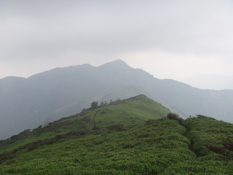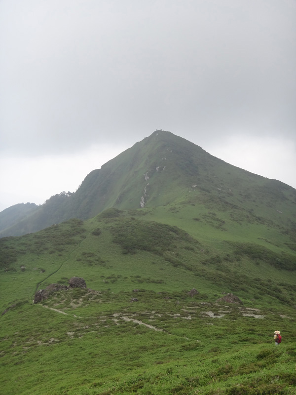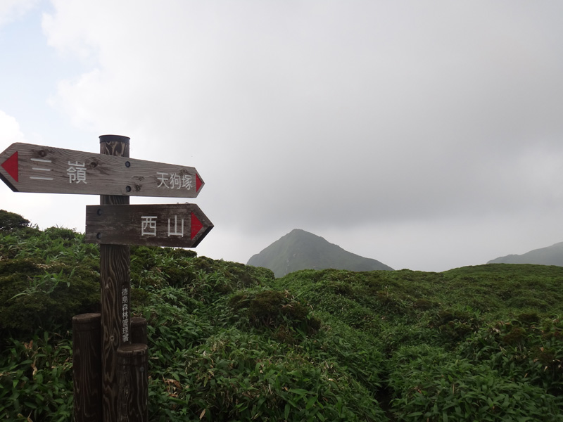 お亀岩分岐まで戻り、まずは西熊山を目指す。 ここの山頂でも少し休憩。 景色はほとんど見えず… 三嶺に向かって歩いていき、コルである大タオを通過し、三嶺への登りに入る。 見た目はけっこう距離もあってきつそうだけど、意外にきつくない登りだった。 せまりくる三嶺が美しい。