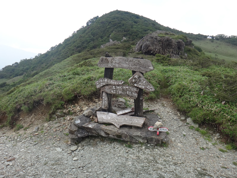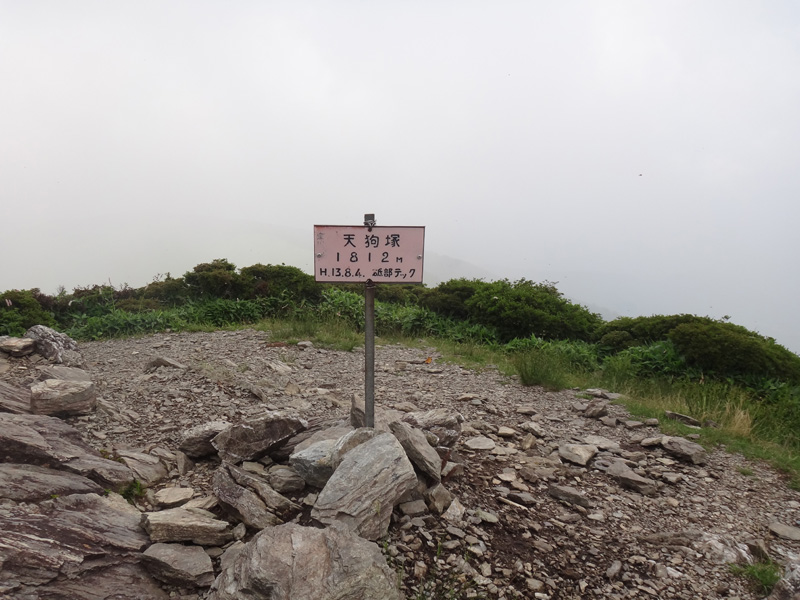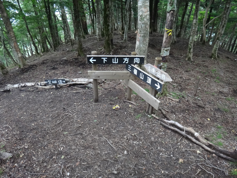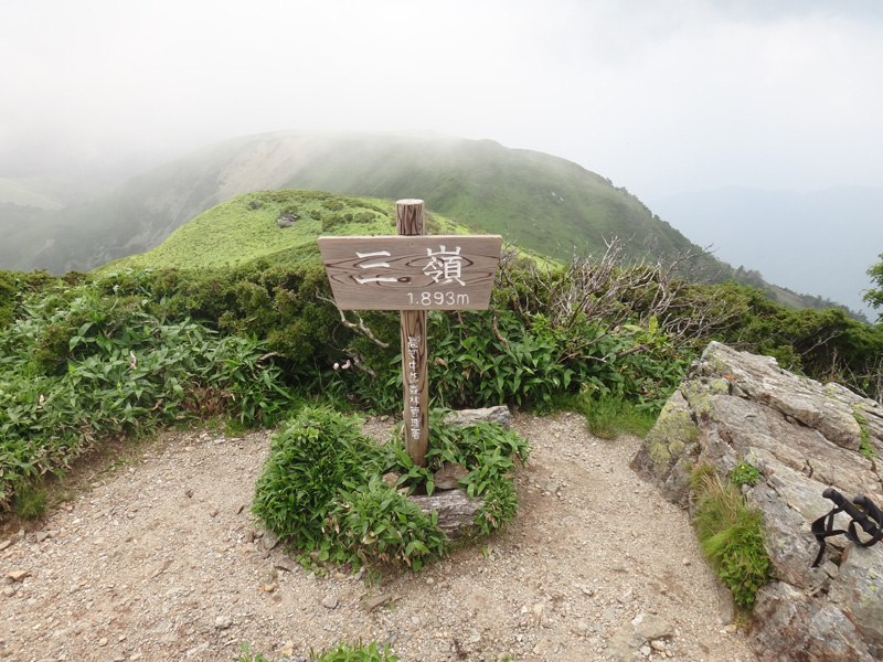 そして三嶺山頂に到着。 この時間なんだけど、山頂は人でにぎわっていた。 女3のパーティは癒しの温泉郷方面へ、男2女1の高齢パーティは白髪山方面へ、女2のパーティも白髪山方面へ帰って行った。
