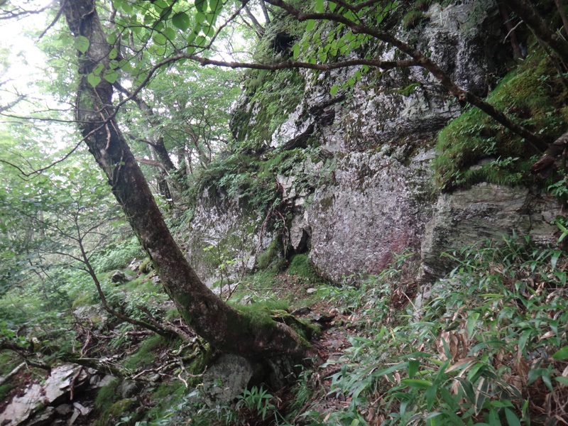久保~西山林道登山口までの道から考えたら、西山林道登山口~1476m地点までの道は傾斜が落ちるので少しは楽になるのだけど、一般的な登山道から見ると、この区間も傾斜は急な方に入るかな。 とりあえず暑さに耐えなくては……