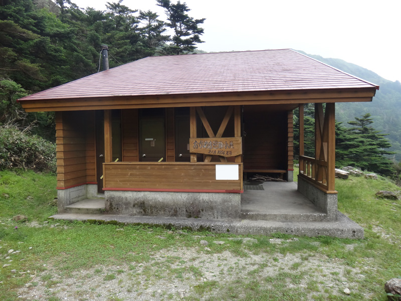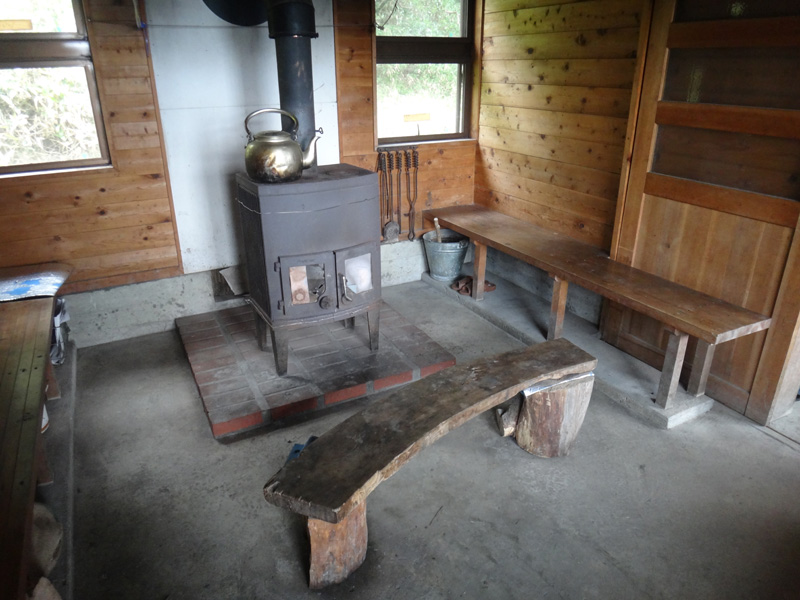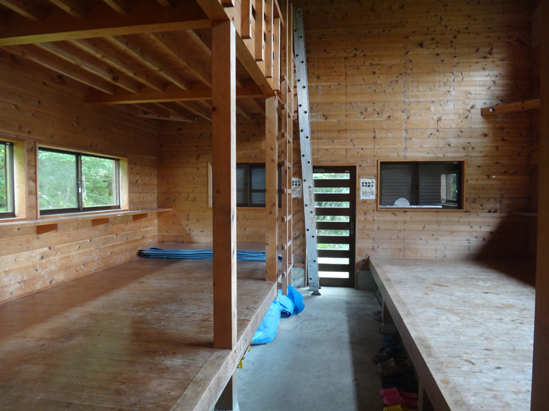 避難小屋まではすぐで、この避難小屋は綺麗でビックリした。 トイレが併設されていて、和式が2つ、男性用が1つ。 和式には木の蓋がしてあり、虫を寄せ付けなかったり、臭いが漏れないようになっていた。 避難小屋の入口の部屋には、薪ストーブがある。 2つ目の部屋は普通の避難小屋のように寝るスペースとロフトが設置されていた。