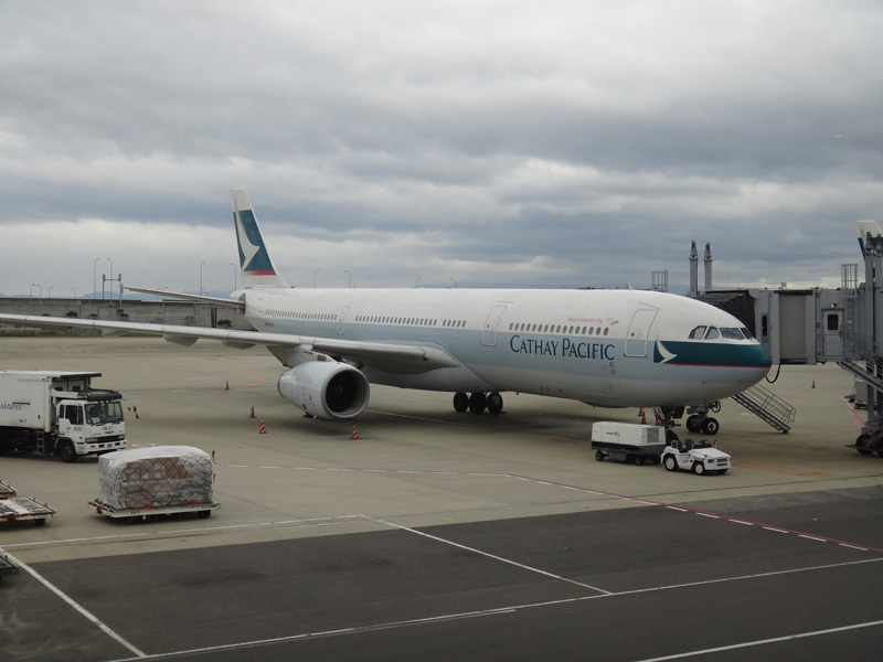 今日乗る飛行機は「CATHAY PACIFIC」という、緑がメインカラーの香港の航空会社。 初めて利用するな。