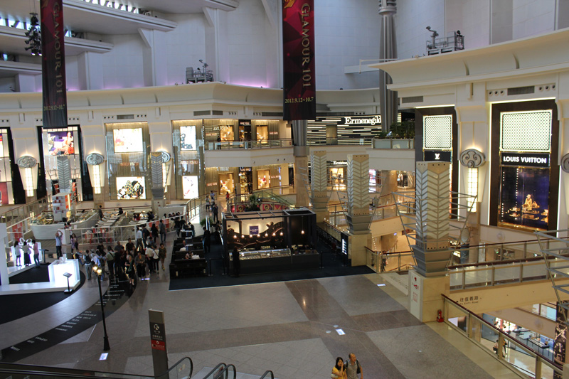 台北101の下層はショッピングモールみたいになっていた。 世界中で名前を聞くような有名ブランドの店が、ずらりと立ち並ぶ。 吹き抜けのロビーのど真ん中には、全てが高そうな、ラウンジみたいなスペースが。 とりあえず目的は展望台に上ることなので、そちらに向かう。