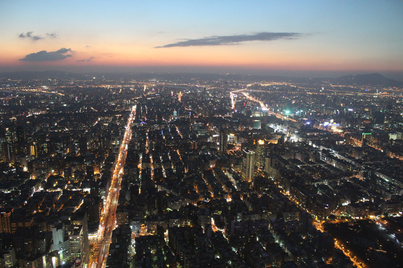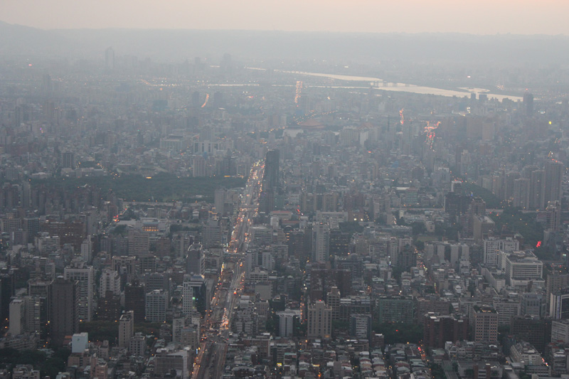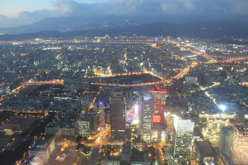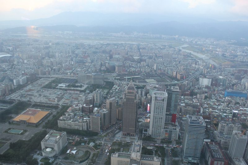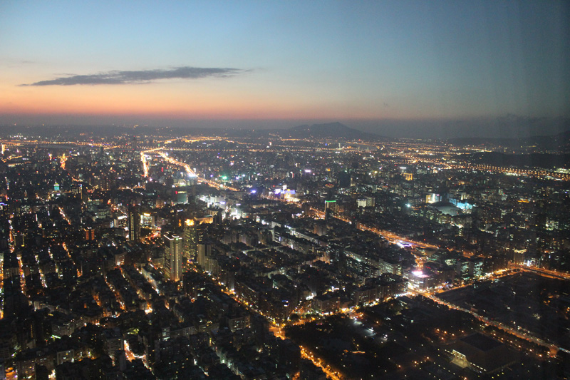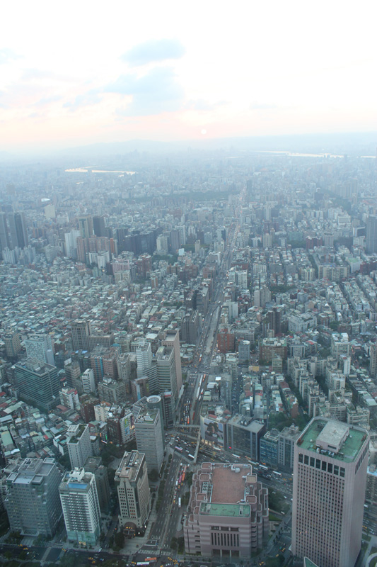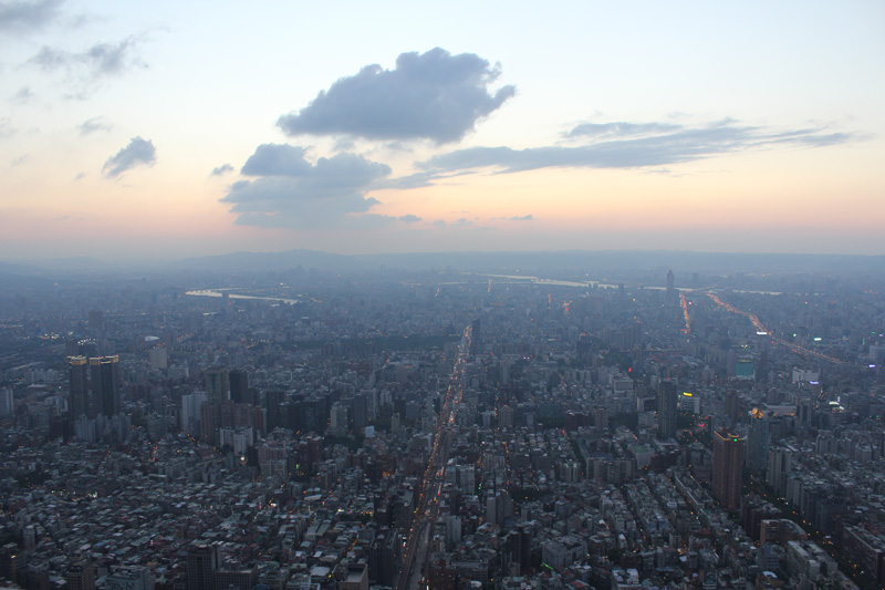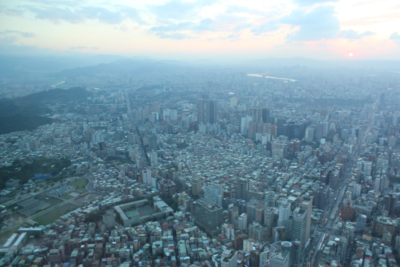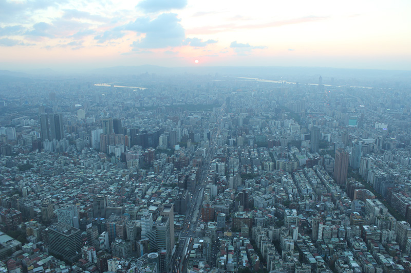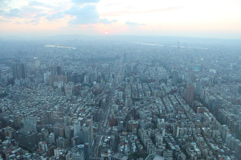 このエレベータは超高速エレベータで、40秒ほどで、一気に400m程上る。 エレベータを降りると、目の前には台湾の町が一望できる景色が! ちょうど夕日の沈む時間でそれも綺麗だった。 四方が見えるようになっているので、全部を見て回る。 すごい景色だ。 そしてなんと、屋外にも展望台があるので、そちらも見に行ってみる。 この高さの屋外ってすごいよね。