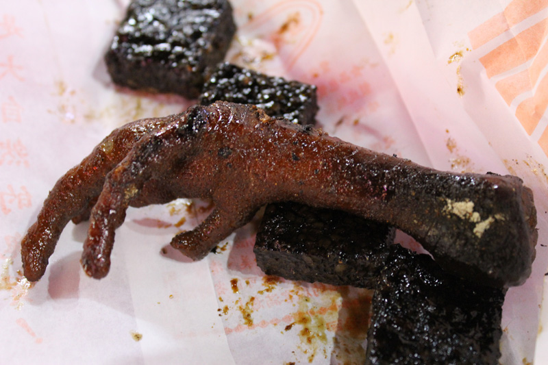 鶏の足と、黒い餅みたいなものを焼いてもらい、さっそく食べる。