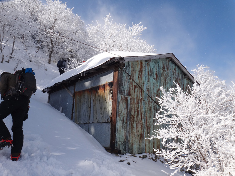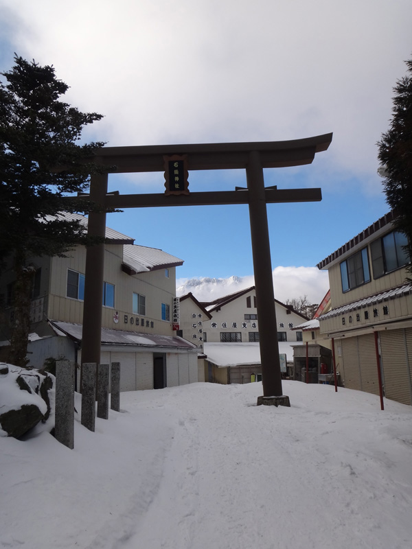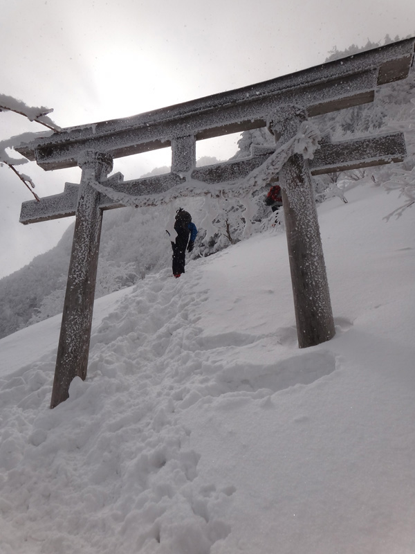 夜明峠を越えて一ノ鎖、二ノ鎖と進んでいく。 土小屋分岐ルートでの鳥居、このあたりでは、いつもより積雪量が多く感じた。 冬季は鎖場登れないので、巻き道で。