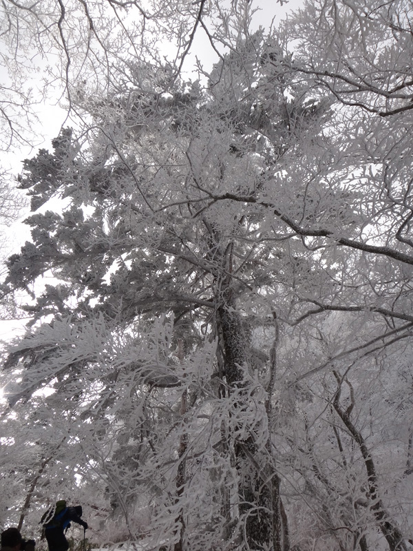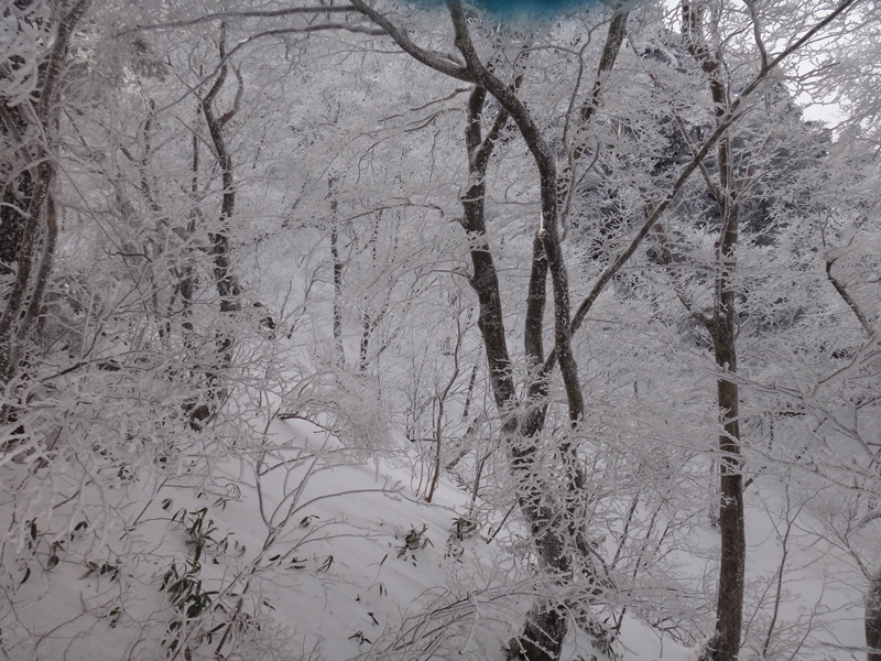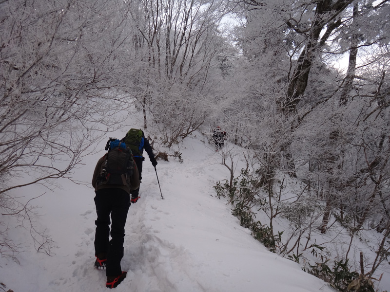 石鎚神社で、4名はアイゼンをつけ、先を目指す。 八丁を越えて、前社ヶ森に向かっての登りになるところで、オレもアイゼンをつける。