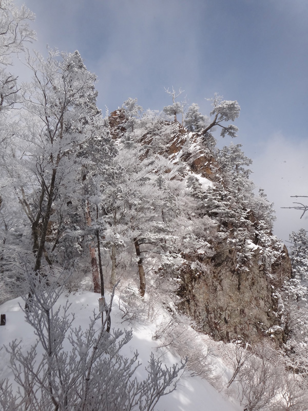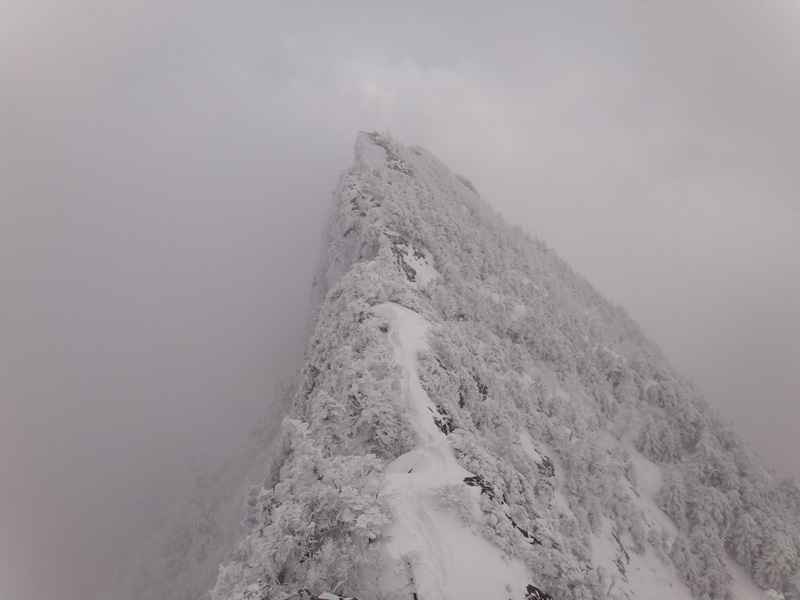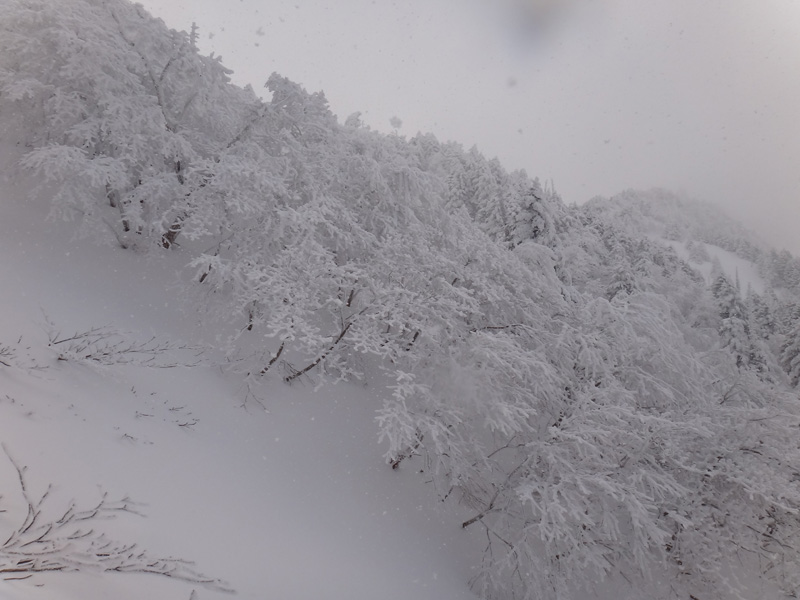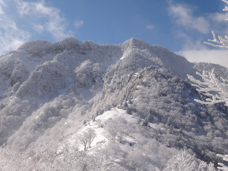 そして、石鎚の絶景が見えてきた! 目の前には真っ白に染まった石鎚の北面。 これからあそこを登っていくのか。