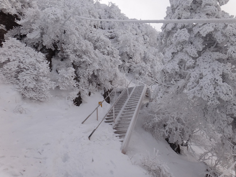 手すりの山側半分埋まっているような箇所もあり、夏の登山道が全く使えず、直登しているような箇所もあり、どんどん登っていく。 三ノ鎖を越えたら山頂は間近。