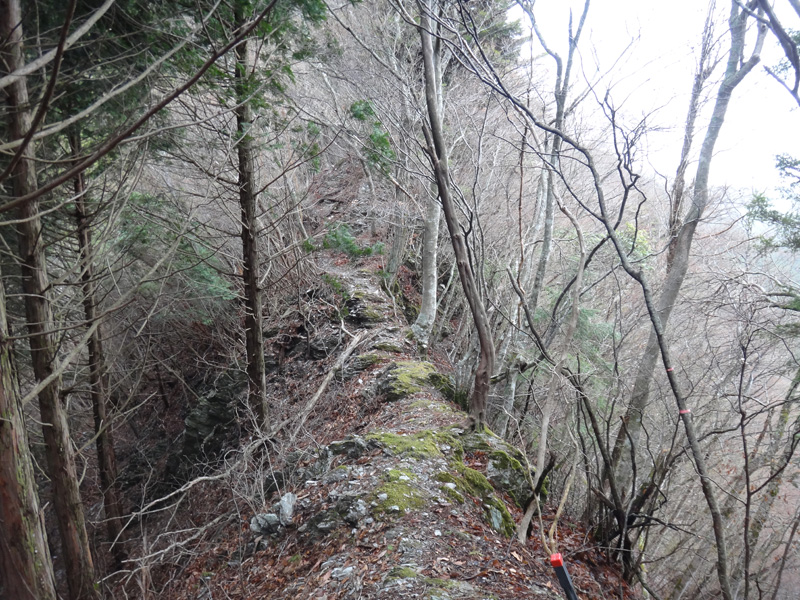 そこからは尾根ずたいにアップダウンを繰り返して進んで行く。 しばらく進むと、なんか見たことのある景色が。 たぶん、前回間違って降りてしまった場所だな。 今日は間違えて降りないように、しっかりと光景を焼き付けておく。