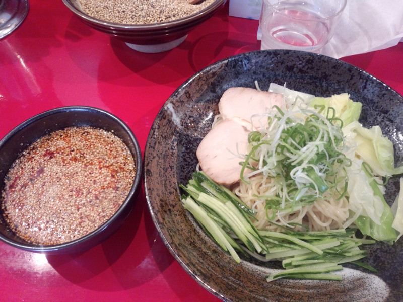 そこでつけ麺を食べる。 この店では辛さが3倍が初めての人向けだったので、おとなしく3倍を食べる。 それと昨日見ていておむすびがすごい美味しそうだったので、それを注文。 こっちでは「おにぎり」じゃなく「おむすび」なのか?