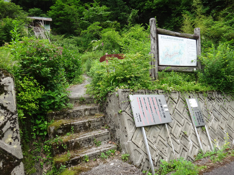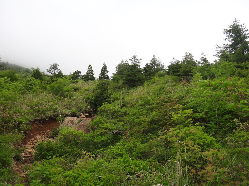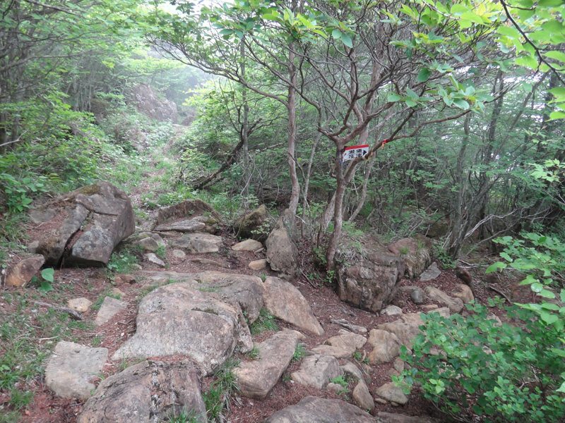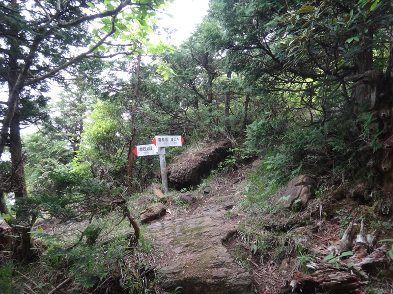 赤石山荘前の道に出て、東に歩いていく。 すぐに筏津・瀬場方面の下山ルートがあるが、そこを直進。 こっから先は初めての道。
