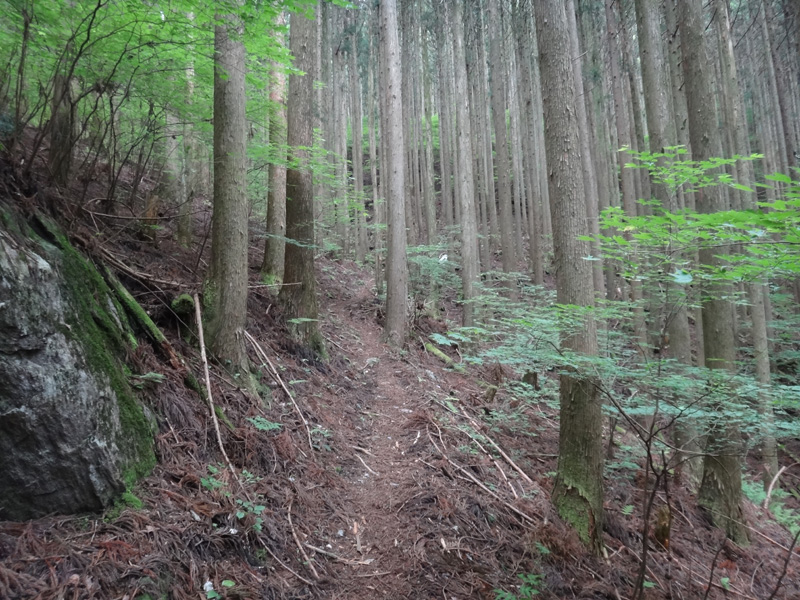 県道脇に車を止めたので、まずは登山口まで少し歩く。 ウォーミングアップといったところだろうか。 登山口から登山道へ。 床鍋ルート、序盤は植林地帯が続く。 ずっと景色が同じなので、面白くないな…… こちらのルートは、筏津ルートに比べると人が少ないので、のんびり登山ができるかな。