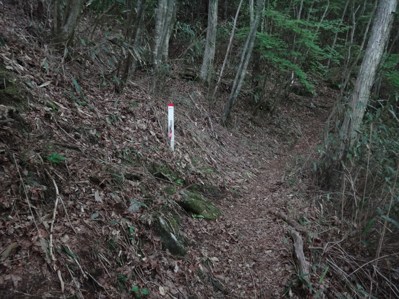 この分岐点が非常にわかりにくい。 看板などはなく、左手の木に、テープが巻いてあるのだけど、そのテープも気づきにくい。