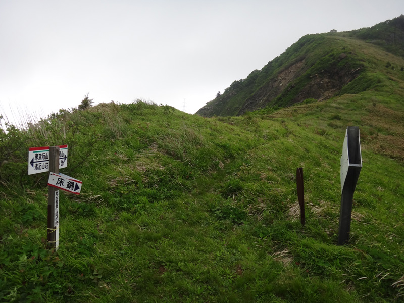 風をしのげる場所がないので、東赤石山頂方面に登っていくか。 少し行ったら、赤石山荘との分岐があるので、そこまで行ったら休もうかな。