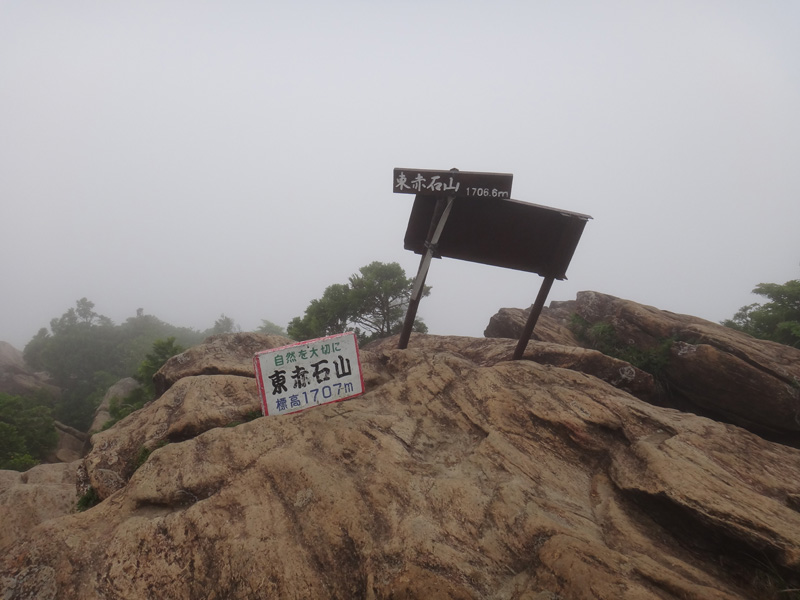 景色が見えないため、距離感もあまりつかめず、東赤石山の三角点に着いてしまった。