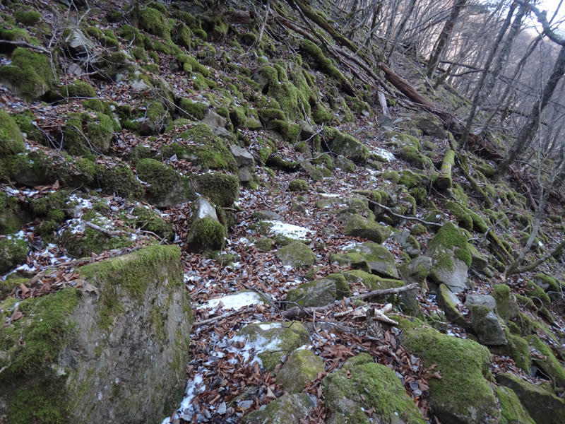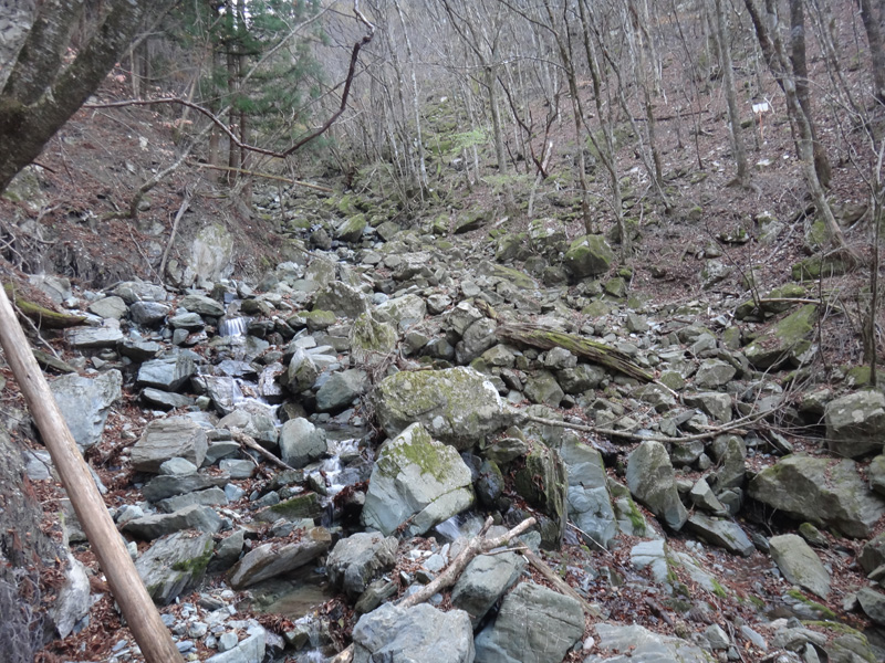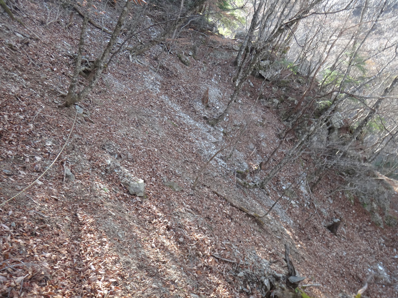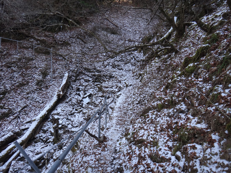 さらに歩いていくと、ザレた斜面が。 ロープも張ってあるし、落ちるようなことはない。 その先には壊れた階段があり、その先に進んでいくと、再度徒渉ポイント。 徒渉というほど、水が流れていなかったけど。