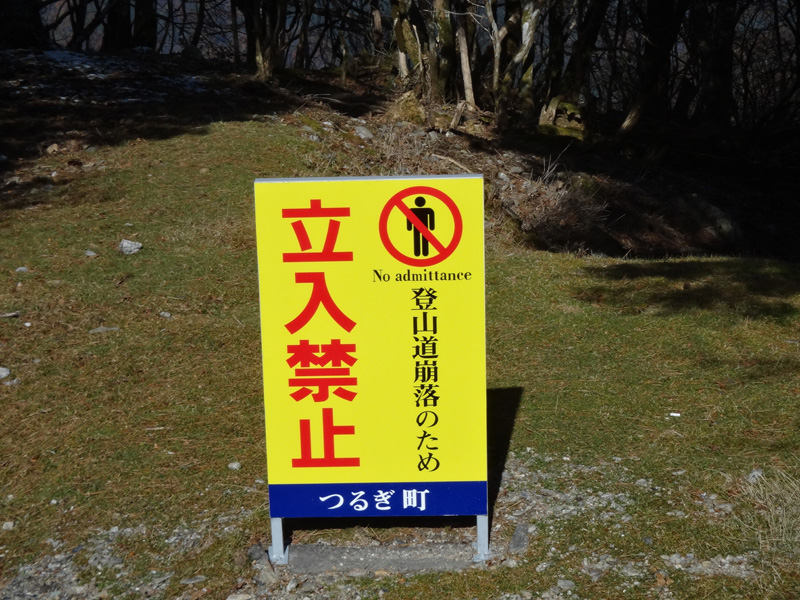 登山の準備をして出発。 登山道の入口には「崩落のため立ち入り禁止」の看板が……