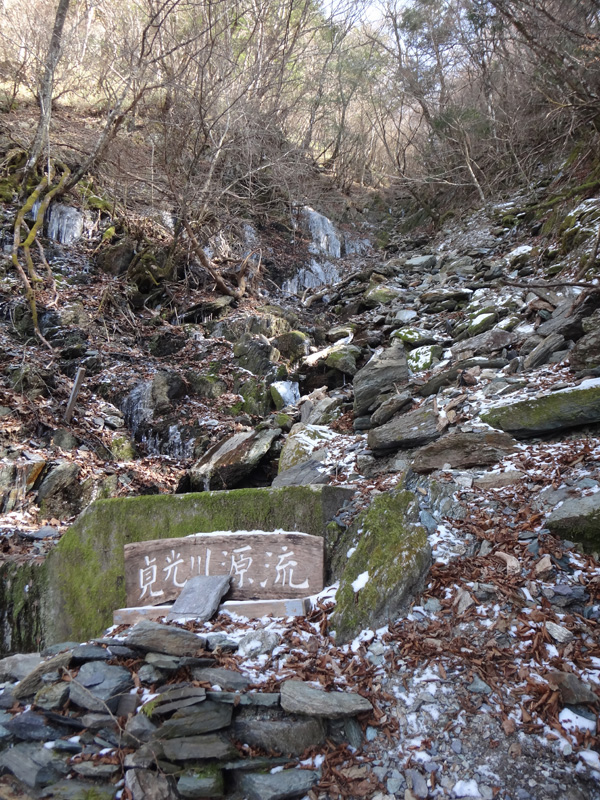 だいぶ休憩しすぎてしまったので、そろそろ行かなくては。 山頂までは、貞光川源流を通る方のルートで。 こちらの日陰には、けっこう雪が残っていた。 貞光川源流は、珍しく水が流れていた。