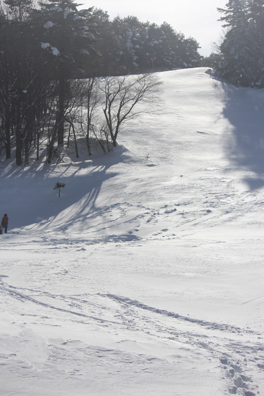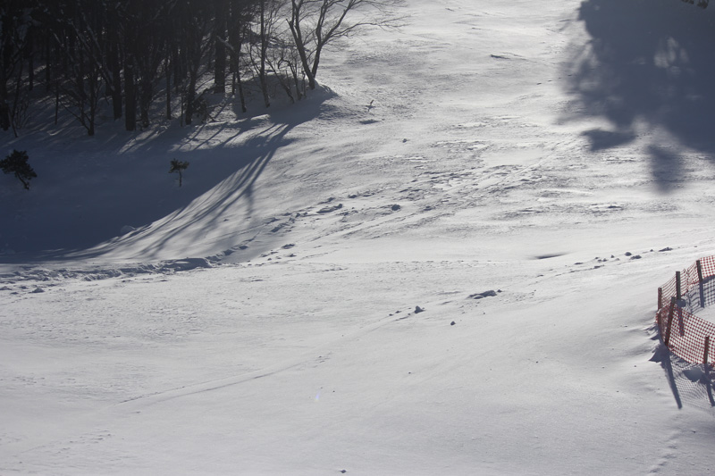 日当たりのいい斜面では、木々についている雪が落ちてきて、そのまま斜面を転がって行ったりして、軽く雪の斜面が崩れたような模様になっている箇所が多数あった。 この辺りになるとクラストしてなく、水分を含んでやわらかくなっている。