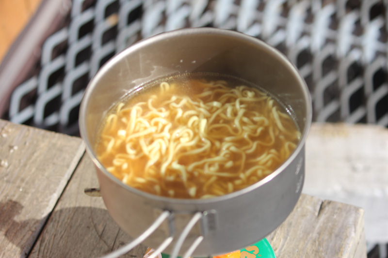 この辺りで、お昼にしようかな。 既におにぎり2つ食べてしまって、残る食料はラーメンしかない。 しかもかなりお腹が空いている。 風の当たらない場所を探して、休憩。 温かいラーメンを食べるが、体は全く冷えていないし、気温もマイナス数度だろうから、そんなに寒くもない。 もう13時過ぎているし、瓶ヶ森山頂まで、このペースだと、まだ1時間以上はかかるだろうから、あまりゆっくりしている時間もない。 ラーメンだけ流し込んで、男山を目指す。