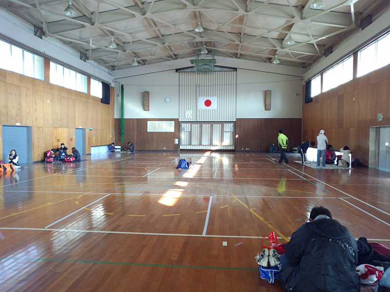 控室として、体育館が開放されているので、壁際に場所を確保。 1時間くらい横になってウトウトと。
