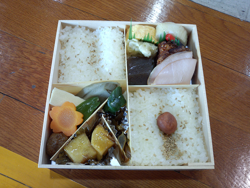 受付可能時刻になったら、スピーカーで知らせてくれた。 受付で、ゼッケンと弁当をもらった。