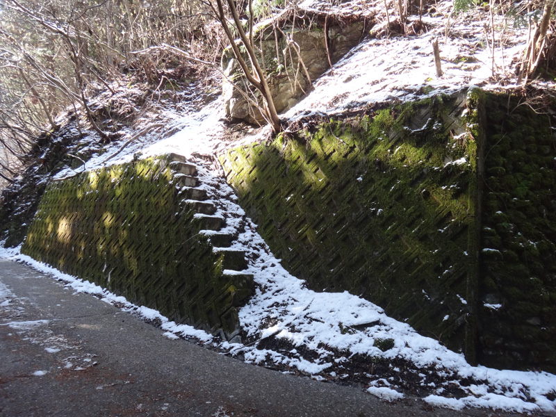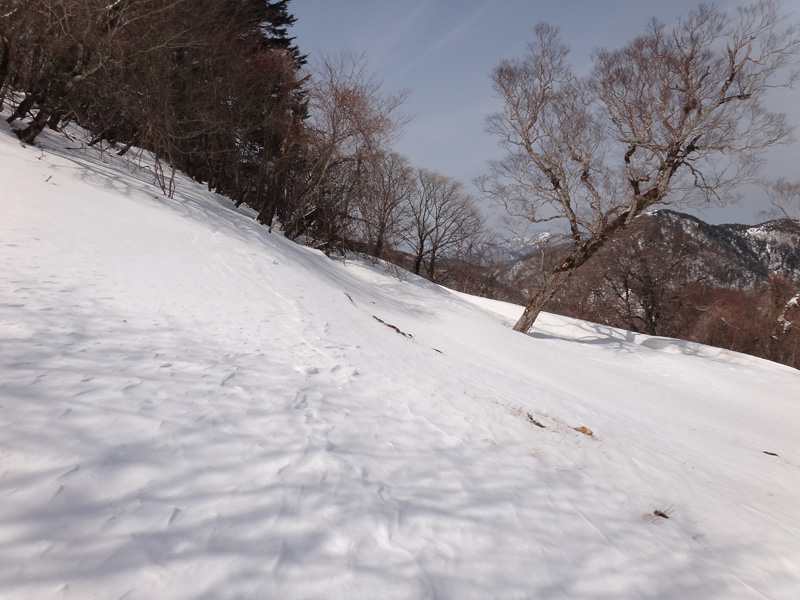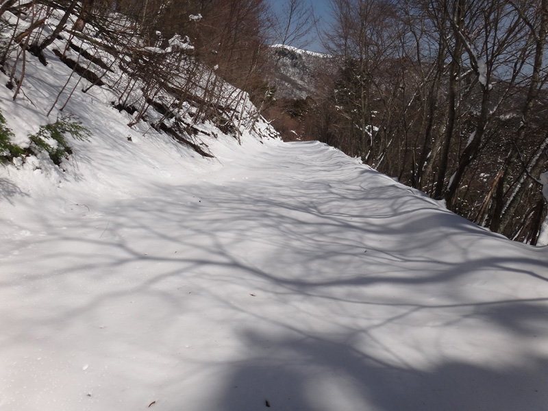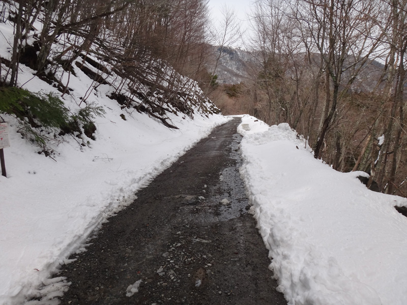 お昼ご飯を食べ終え、下山することに。 積雪が多い地帯は、下山も楽ちんだろう。 追分までは一瞬で下りてくるおkとができた。 そこから先も速いペースで下りられたのだけど、雪がかなり溶けてきてベチョベチョだ。 溶けすぎて、逆に滑ったりするので、気をつけなくては。 行くとき雪に埋もれていた林道は、除雪車が入ったみたいで、綺麗になっていた。 が、この林道、除雪する意味はあるのか? 誰か通るのかな。