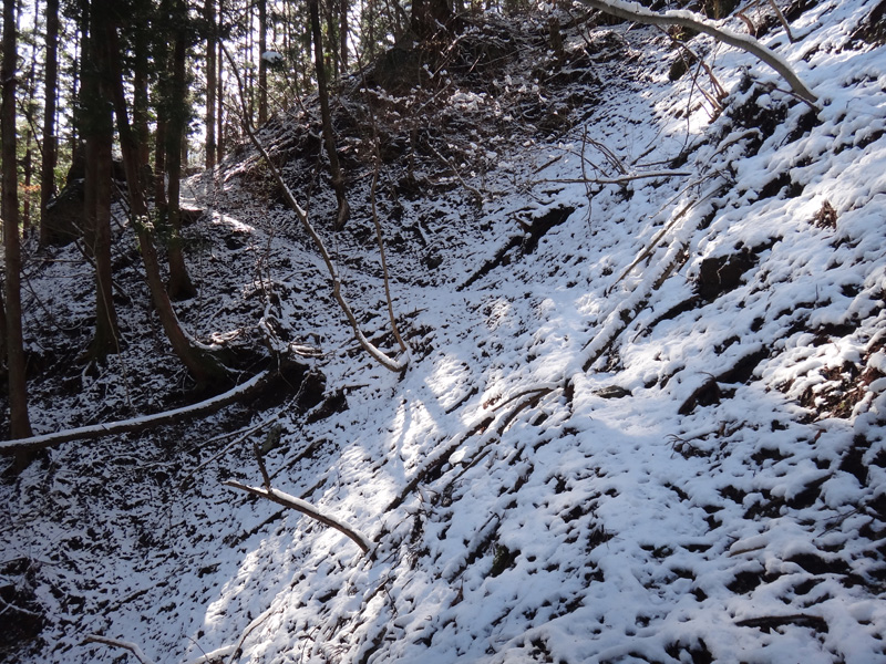 ここからは神社の裏の斜面を歩いていく。 林道をいったん横断したが、林道は雪に埋もれていた。