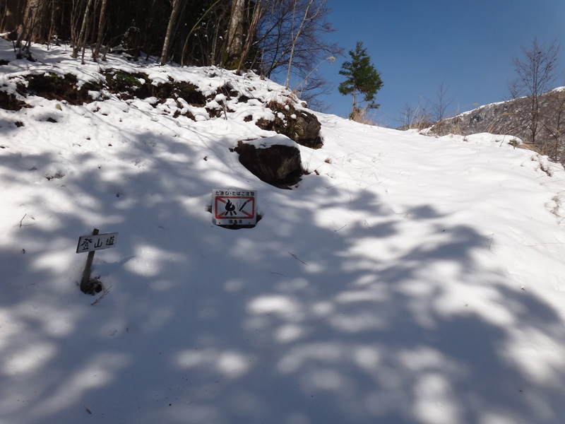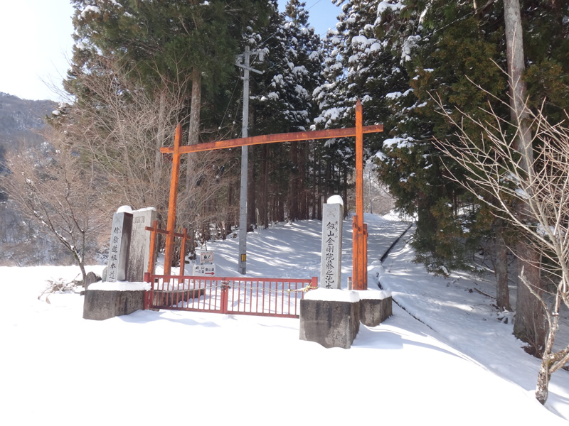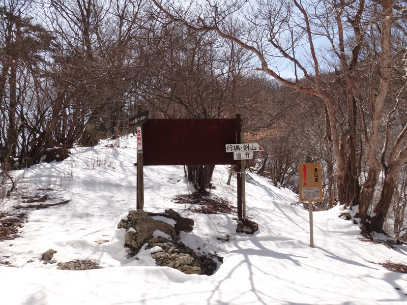 まずは剣神社まで。 林道を少し歩き、登山口へ入っていく。 登山口から山の中へ。 この辺りでの積雪はほとんどない。 あっても数cm程度。 だが、どんどん高度を上げていくにつれ、雪が多くなっていく。