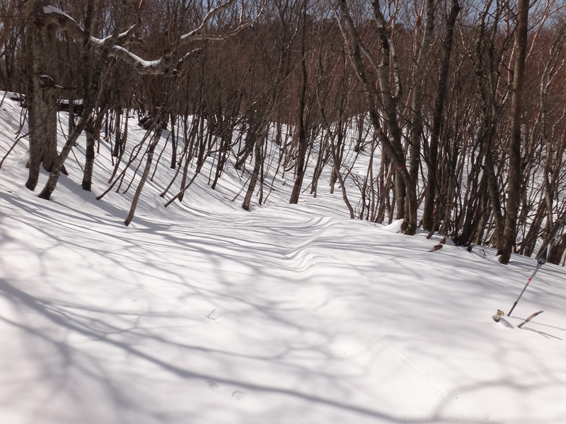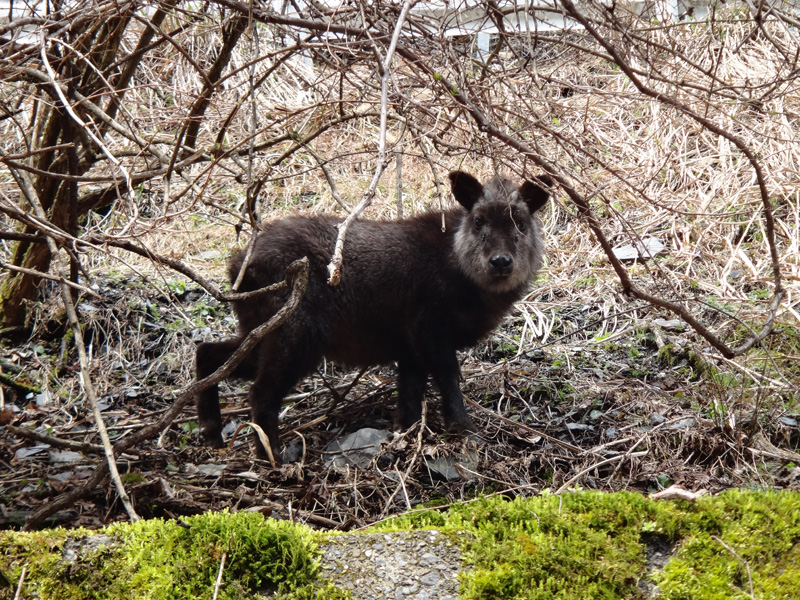 剣神社を通過し、コリトリまでの下り。 ここはもう雪は無いのと同じだった。 急斜面を滑らないよう慎重に下りていき、コリトリまで到着。 車に戻って着替えをしていたら、ニホンカモシカを発見した。 近づいてもなかなか逃げないので、いい写真が撮れた。