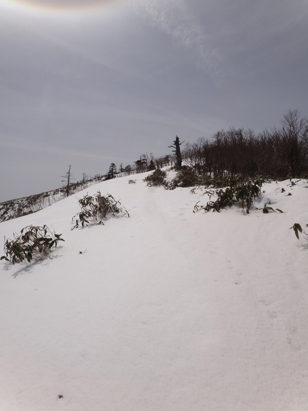 この先は、雪の量が大分増える。 膝くらいまで埋まる箇所も多々あり、苦労しながら登っていく。 だが、ここまで来たら、山頂まではもう1時間もかからない。 ラッセルがつらくても、終わりがすぐなので、それほど力まないで行けそうだ。