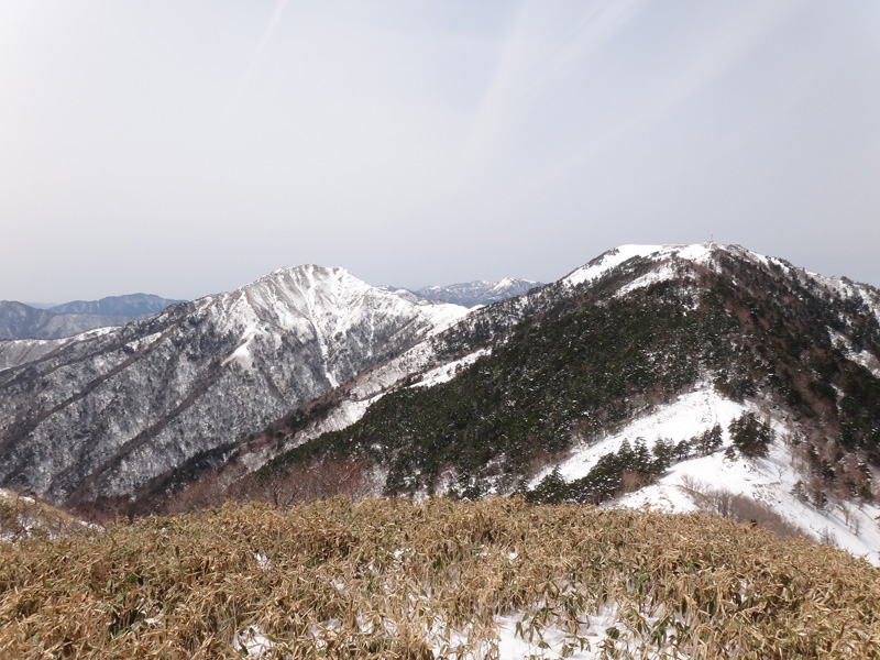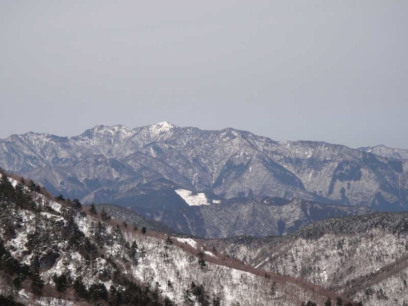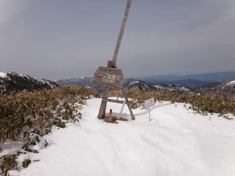 樹林帯を抜け、最後の登り。 程なくして、一ノ森ヒュッテに到着。 ヒュッテの前は、積雪50cmくらいだった。 休む前に山頂に行って来よう。 山頂からの景色は素晴らしかった。 剣山、次郎笈はもちろん、その山の間から三嶺も綺麗に見える。 南は中東山、石立山。 北は赤帽子山、津志嶽、黒笠山、矢筈山。 東は槍戸山、天神丸など。 360度の大展望だった。