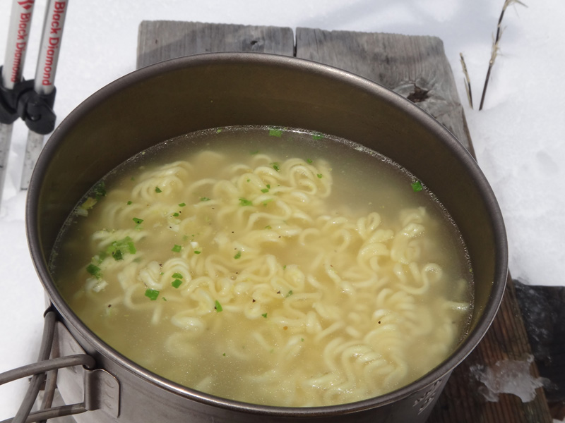 ヒュッテ前に戻り、ここでお昼ご飯。 インスタントラーメンを作って食べる。 朝は寒かったが、この時間はポカポカで気持ちがいいな。 この場所は無風だし。