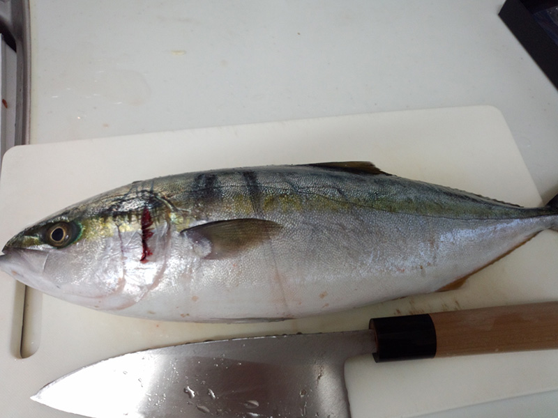 包丁が無いので、西村ジョイで包丁を購入。 いろいろアドバイスしてもらって、15cmの出刃包丁を買った。 包丁もものすごい種類があって、どれにすればいいのか全然わからなかったのでアドバイスを求めたのだが、2000円で買えるやつもあれば、16000円のやつもある。 金鋼、銀鋼、みたいな種類もあるし、持ち手の素材でも値段が変わるみたい。 切れ味抜群の金鋼というやつを購入したが、鋼なので、手入れを怠るとすぐに錆びてしまうみたい。