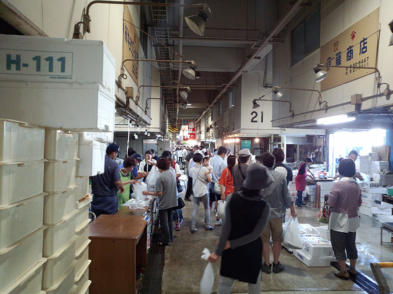 まずは鮮魚コーナーから。 狭い通路の両脇に魚屋がずらりと並んでいる。 全部で20店舗くらいあるのかな? 普段きむらで買うものよりはるかに鮮度はいいのだけど、値段もそんなに安いわけではない。 いろいろ見てたが、買えそうなものがサンマくらいしかなかった…… サンマ1匹50円の激安。