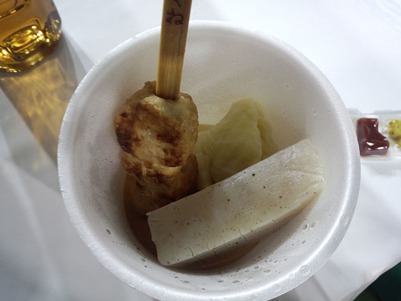 外は強い雨が降っており、時折吹く風が寒かったが、うどんやおでんを食べて温まる。