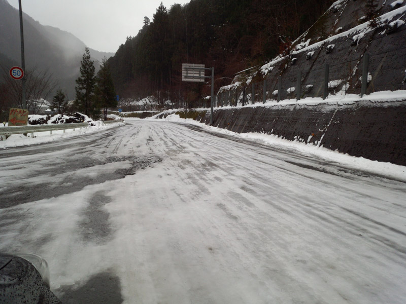 下りはブレーキが全然効かない。 時速30kmくらいで走っていても、止まるのに20mくらいかかる。 制動が効かず雪の上を滑っていくような感じだ。 安全運転で戻ってきた。