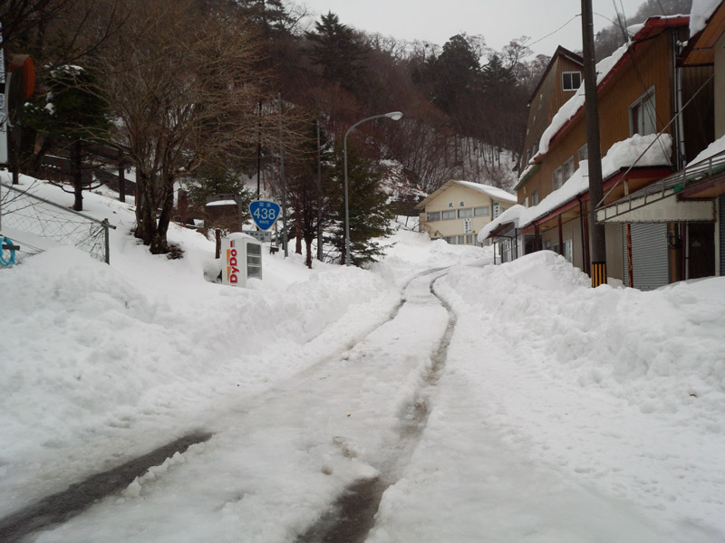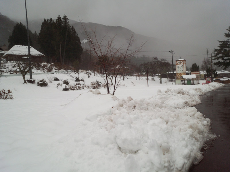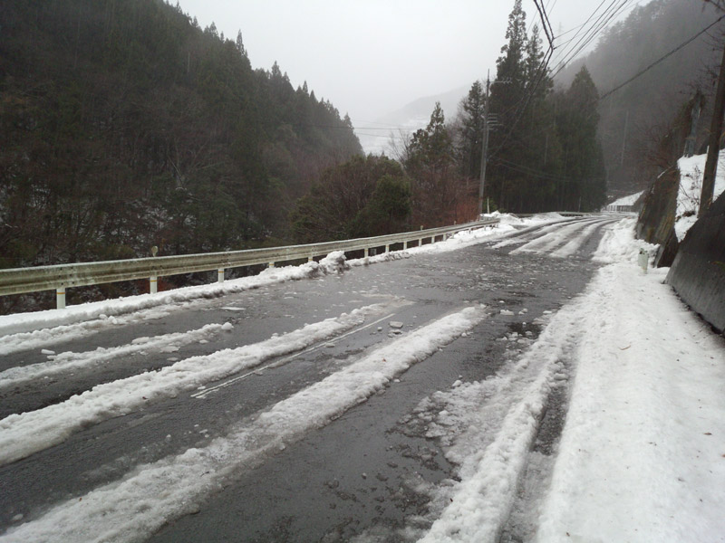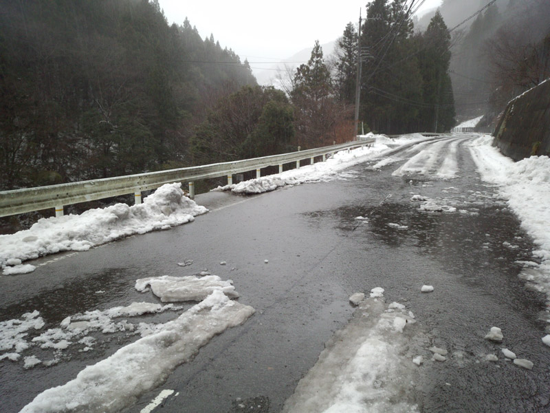 京上トンネルから先は路面にも雪が出現。 雪が融けて氷の部分が出てきてたり、水混じりのベチョベチョな雪だったりして、運転に非常に気をつかう。