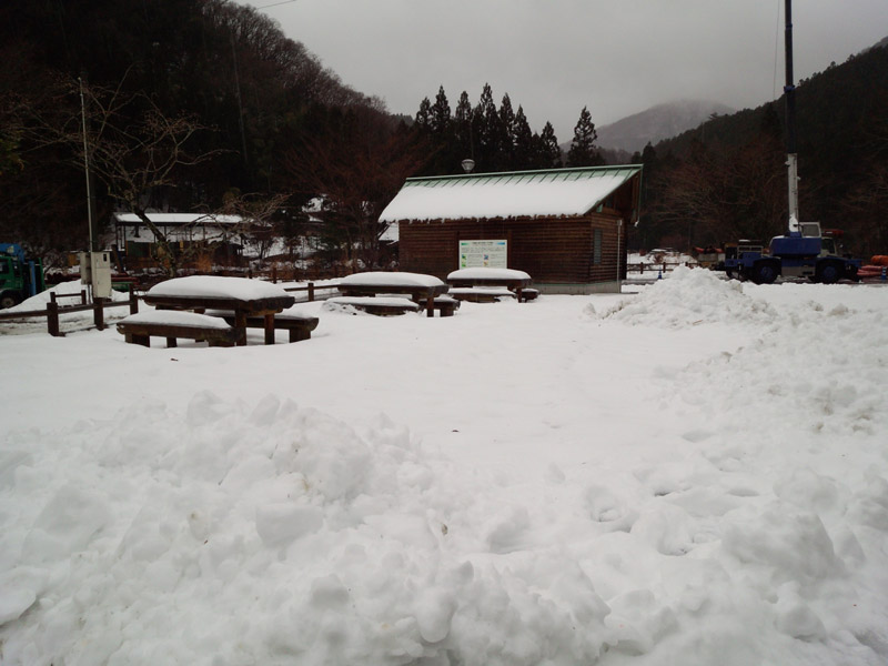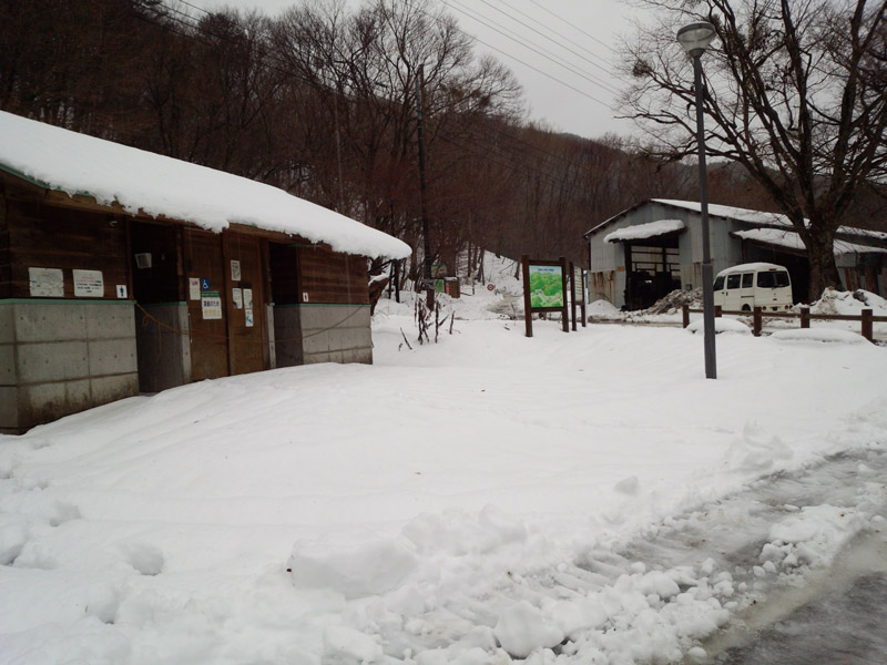 雪の道の中、三嶺登山口の癒しの温泉郷と名頃に行く。 駐車場には工事車両が止まっていて、トイレは冬季閉鎖されていた。 当然登山者はゼロ。
