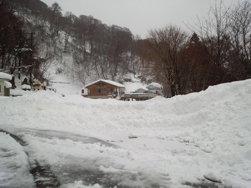 そのまま見ノ越を目指して走って行く。 丸石パークランドも雪に覆われている。 そしてここから先、道が険しくなった。 雪がだいぶ残っていて、ものすごい滑りながら上っていく。 カーブ曲がってるとタイヤが滑って、雪の壁に車の前部を何度かこすった。