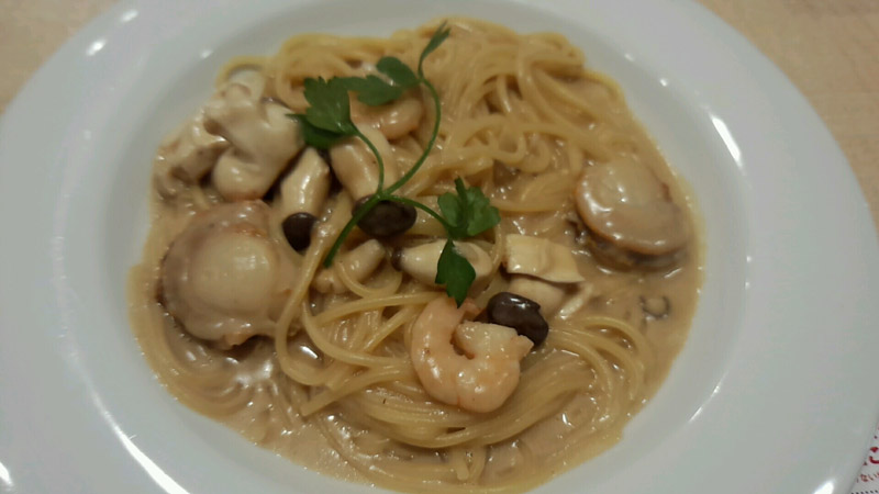 「帆立と海老のポルチーニクリームソーススパゲッティ」という新メニューを食べる。 キノコはでかくて食感が素敵だった。