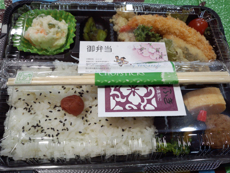 1時間ほどゴロゴロしていると、受付の準備が出来たらしいので、受付に。 ゼッケン、参加賞、お弁当を引き換えてくる。 時刻は9時半、走るのは12時5分から。 それまでに消化しないといけないので、すぐにお弁当を食べる。 先ほどおにぎりとパンを食べてしまったけれど、今しか食べるタイミングがないので。 かなりお腹いっぱいになってしまった。 お弁当は何種類かバリエーションがあるみたいだった。