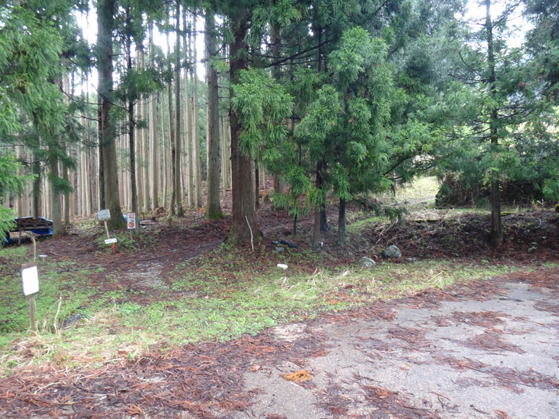 登山道を横切るようにして工事されている林道を2度またぎ山の中に入っていく。 登り始めてすぐ、前方から青色レインコートの格好をした男性が下りてきた。 上で泊まっていて、もうこの時間に下りてきたよう。