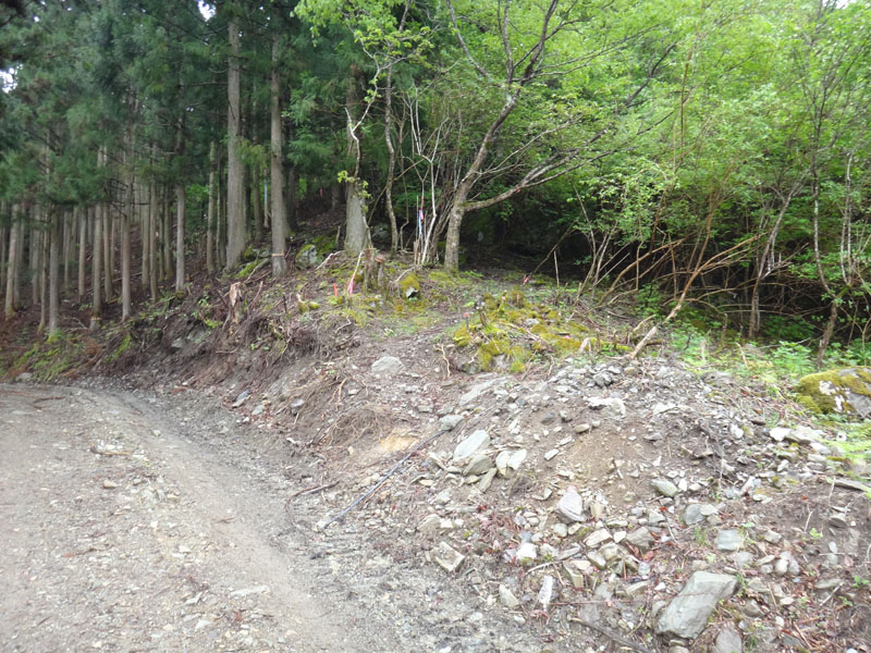 1006m地点はどこだかわからず、その先の4差路分岐みたいな場所のテープを発見。 これを下って行くと、新居浜CCや大久保特別支援学校のルートか?
