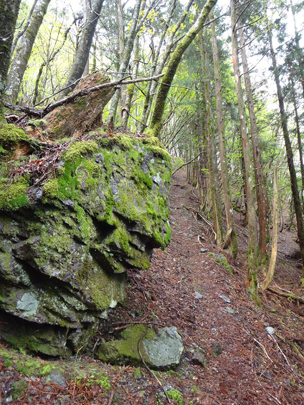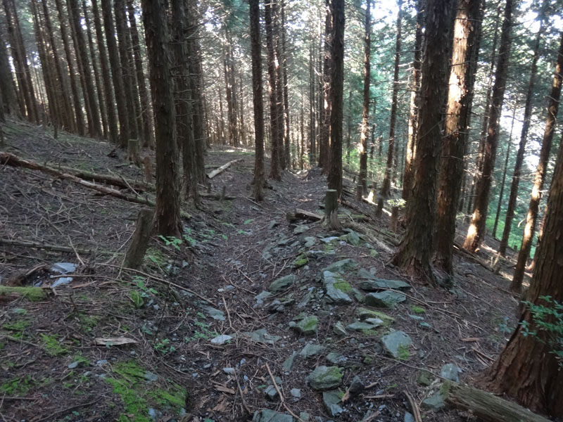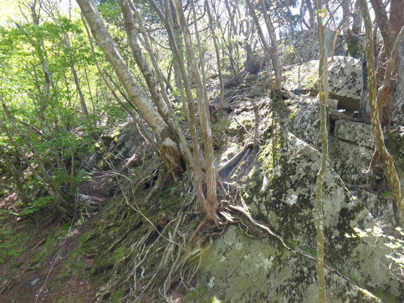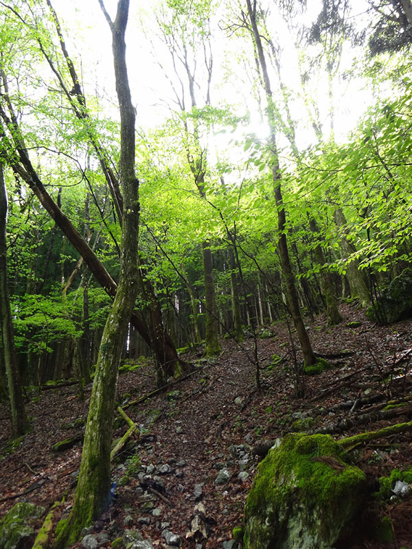 上兜山に向けて、まずは強烈な下りから始まった。 ロープがかかっている下り、かなりの急傾斜がしばらく続く。 鞍部まで下ったら、そこからダラダラとした登りが始まった。 水の通り道のような場所をひたすら歩いて登って行く。 このあたりは尾根が広く、道を見失わないよう気をつけながら歩いて行く。