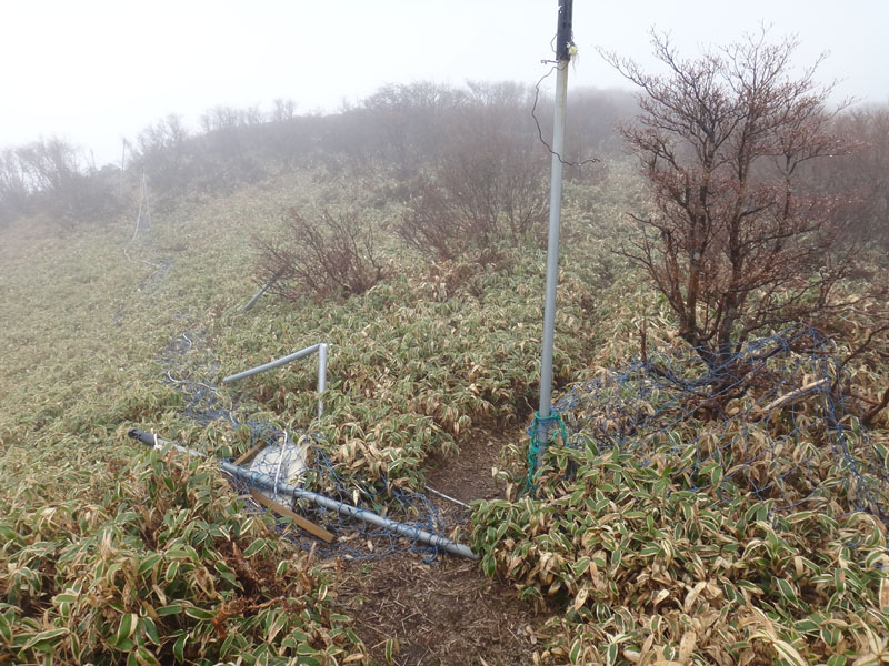 一旦下って、三嶺避難小屋に向かって登って行く。 途中で、鹿除けネットがあるのだけど、なんとネットの支柱がポキっとオレてしまっている。 鹿除けネットは意味をなさず…… 折れている箇所以外もネットはボロボロだった。