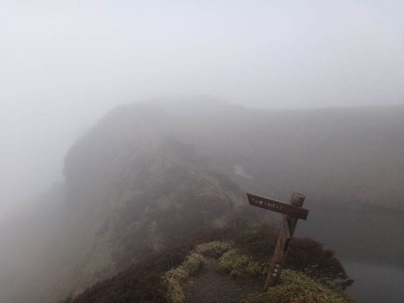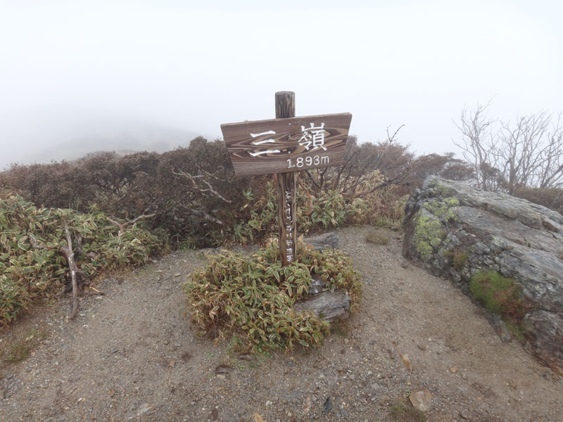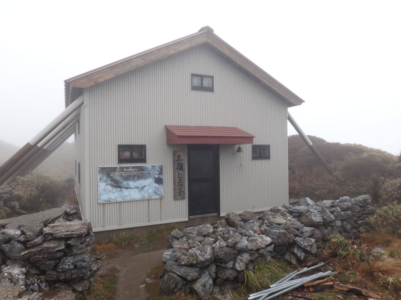 一気に山頂まで登って、写真だけ撮ってすぐに避難小屋に戻る。 山頂には男性が1人、女性が1人いた。 男性は霧雨の中、ご飯を食べていた。