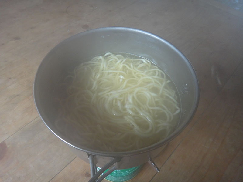 端っこのスペースを確保して、ここでお昼休憩。 靴と靴下を脱いでくつろぐ。 上着はあまり濡れずに済んだので、脱いで乾かす。 ここでお昼ごはん、インスタントラーメンを作って、おにぎりと一緒に食べる。 食べ終わったあとも少し休憩する。