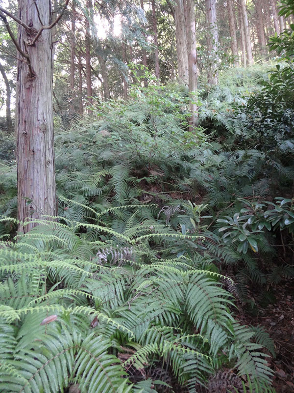 そのまま山に入っていく。 道はない…… 適当に上に登って行く。 少し進むと道らしきものは合ったのだけど、すぐに木々に覆われて歩けなくなったり、一面のシダ植物によって道を見失ったり、突然道らしきものが消えたりと、全く役に立たない……